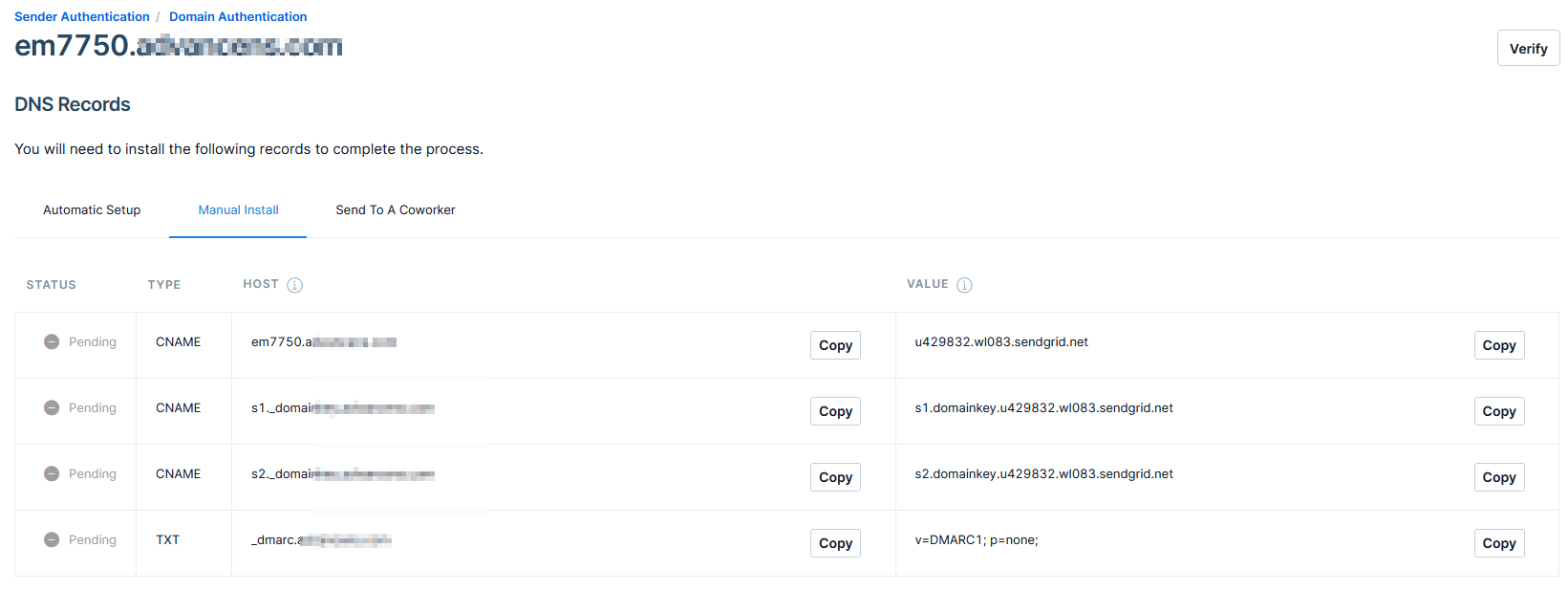 You will receive an email from us containing the DNS records (typically CNAME, DKIM, and possibly DMARC) that need to be added to your domain’s DNS settings.