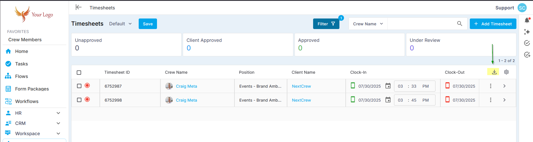 Open the module/screen containing the list of records you wish to export (e.g., Crew Members, Orders, Clients).