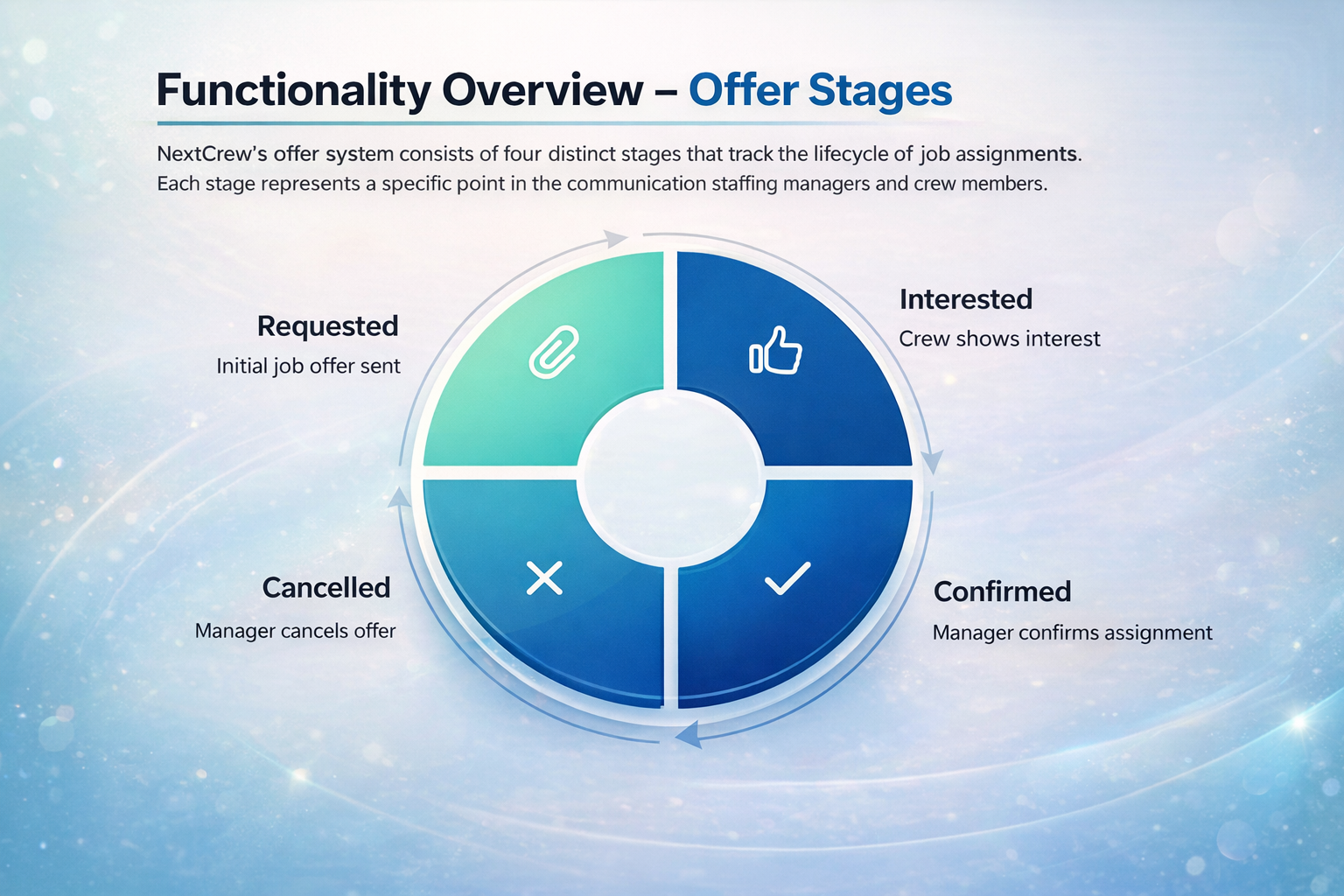 The Offer workflow in NextCrew helps staffing agencies efficiently manage job assignments and communication between managers and crew members. Each offer moves through different statuses that reflect where the job stands — from request to confirmation or cancellation. Understanding these stages ensures that offers are managed effectively and both crew and staff are kept informed.